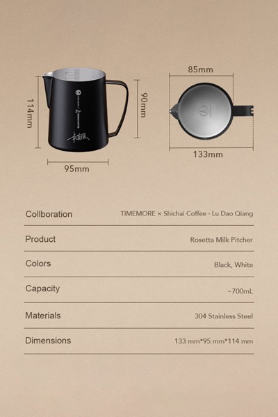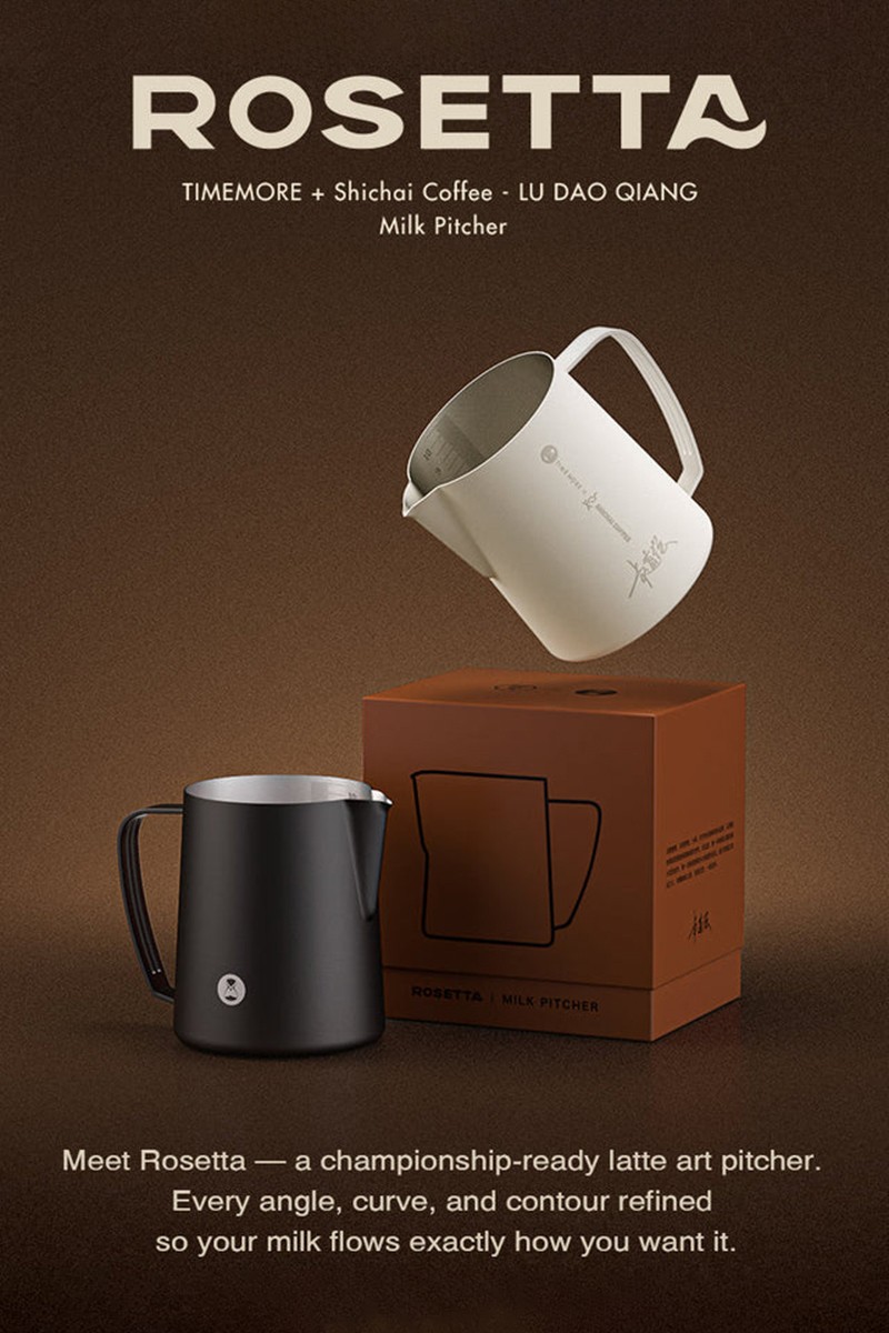 Rosetta Signature — подписная версия питчера: коллаборация Timemore × Shichai Coffee с Lu Dao Qiang. На корпусе нанесена фирменная подпись, подчёркивающая статус серии. Такой питчер выбирают не за «просто объём», а за профессиональную геометрию и предсказуемость в работе с молоком — когда важны стабильность и аккуратность латте-арта.